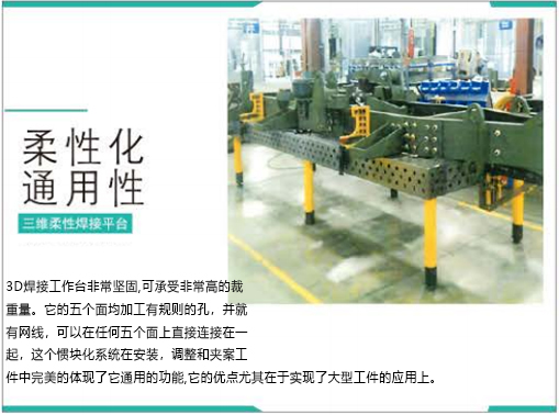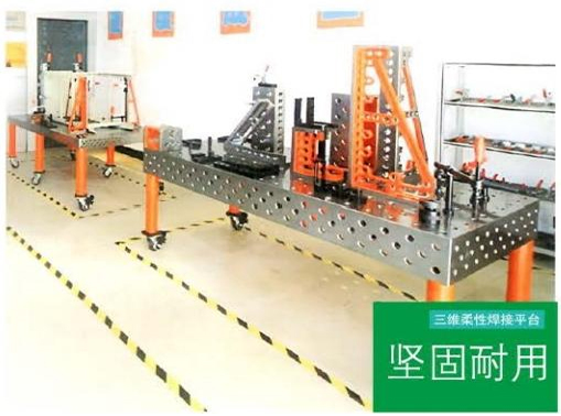 三维柔性焊接平台的主要优点是灵活性和可调节性。它可以适应不同尺寸、形状和位置的焊接工件,以及不同的焊接需求。通过调整平台的水平、垂直和旋转运动,可以实现多种焊接路径和角度,提高焊接的准确性和效率。
